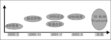 2000年5月,中國(guó)移動(dòng)推出了WAP服務(wù),但是由于準(zhǔn)備不足,加之中國(guó)移動(dòng)沒(méi)有完全轉(zhuǎn)變經(jīng)營(yíng)理念,使得WAP服務(wù)沒(méi)有達(dá)到預(yù)期的發(fā)展目標(biāo)。在吸取WAP服務(wù)的經(jīng)驗(yàn)、教訓(xùn)后,中國(guó)移動(dòng)于2000年11月又推出了“移動(dòng)夢(mèng)網(wǎng)”計(jì)劃。在這次的業(yè)務(wù)推廣中,短消息受到了人們的寵愛(ài),發(fā)展到現(xiàn)在,SMS已經(jīng)深入多數(shù)移動(dòng)用戶的心中。2001年7月,中國(guó)聯(lián)通也推出了“聯(lián)通在信”與“移動(dòng)夢(mèng)網(wǎng)”進(jìn)行競(jìng)爭(zhēng)(如圖1所示)。與此同時(shí),中國(guó)移動(dòng)又開始了GPRS的試點(diǎn)工作,經(jīng)過(guò)近一年時(shí)間,“聯(lián)通在信”并沒(méi)有取得更好的成績(jī),而中國(guó)移動(dòng)的GPRS終于開始正式商用。那么,未來(lái)的移動(dòng)數(shù)據(jù)業(yè)務(wù)將依托什么來(lái)發(fā)展呢?是3G,還是WLAN、藍(lán)牙?大家只能拭目以待。