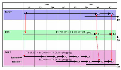 API規(guī)范。這些組織主要包括ITU-T、ETSI、IEEE、IETF、3GPP、OMG、TINA-C、Softswitch論壇、JAIN等。目前,Parlay工作組、ETSI和3GPP已經(jīng)聯(lián)合起來,共同發(fā)展Parlay協(xié)議。圖2為3個(gè)標(biāo)準(zhǔn)組織發(fā)布的Parlay版本的對(duì)應(yīng)關(guān)系。