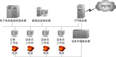 中型呼叫中心:座席代表在50~100之間。據(jù)專業(yè)數(shù)據(jù)統(tǒng)計公司預(yù)測,中型系統(tǒng)需求量最大,因此不少呼叫中心軟、硬件開發(fā)商對準(zhǔn)這一目標(biāo)進行開發(fā)。這種系統(tǒng)結(jié)構(gòu)相對簡單,投資也少,容易被中、小企業(yè)所接受。目前我國的一些公司開發(fā)系統(tǒng)多屬于此種類型。它可以省掉大型交換機的投資,而利用PBX與CTI服務(wù)器和業(yè)務(wù)代表座席直接相連,業(yè)務(wù)代表席同時與應(yīng)用服務(wù)器相連,客戶資料也存在應(yīng)用服務(wù)器中,可實時地將接入電話的客戶姓名自動在計算機屏幕上彈出。CTI服務(wù)器一般由CTI硬件開發(fā)商的板卡和PC組成,其擴容和增加功能也比較方便,成本也低,因此是一種投資小、見效快、升級也很靈活的系統(tǒng)。