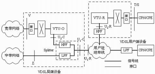 、 VTU-R 分別是位于局端和用戶端的VDSL收發(fā)器。業(yè)務分離器(Splitter ,包括HPF和LPF)將同一對電話銅纜上傳輸?shù)腣DSL與窄帶業(yè)務(或ADSL)