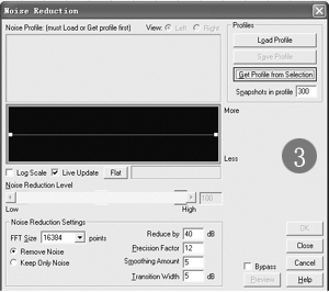 from Selection按鈕,程序會讀入噪音樣本,之后關(guān)閉該對話框回到主界面,單擊噪音樣本音軌,按Delete刪除它,再雙擊另外一個波音音軌,進入波音編輯器界面再雙擊,全選之后按照上面的操作再次打開Noise