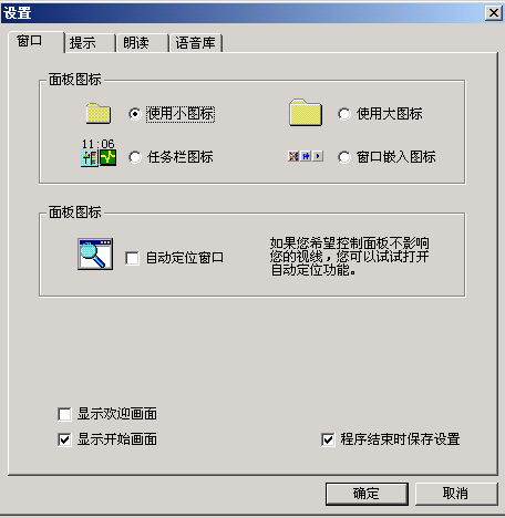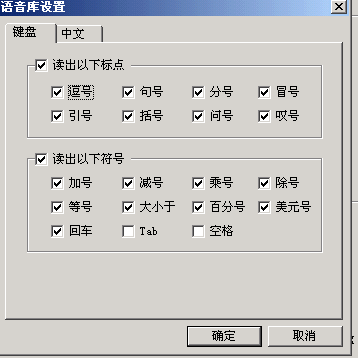 如果需要進一步的調(diào)整,可以選擇菜單里的“設(shè)置……”。打開設(shè)置窗口(如圖3)。窗口共分四個選項,每個選項里除了剛介紹的幾種常用功能調(diào)整外,還可以控制歡迎畫面、開始畫面、設(shè)定存儲等功能,規(guī)定提示速度、朗讀速度的快慢,選擇提示方式,設(shè)定提示報警條件。在“語音庫”選項中還可以選擇朗讀為男聲還是女聲。單擊“設(shè)置”按鈕,可以根據(jù)具體需要選擇“鍵盤”或“中文”里被朗讀標點符號的種類(如圖4)。