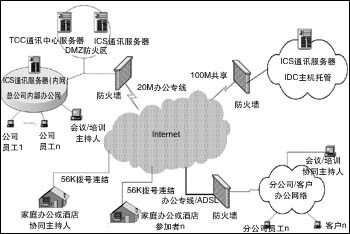 在實(shí)際建立的系統(tǒng)中,采用了公司內(nèi)部3臺服務(wù)器。一臺ICC主要用作登錄認(rèn)證及用戶和服務(wù)器管理;2臺ICS服務(wù)器,一臺布置在防火區(qū),供外網(wǎng)用戶的訪問,一臺在內(nèi)網(wǎng),供公司內(nèi)部員工使用。在公司外面,托管了一臺ICS(通訊服務(wù)器),供公司外部用戶訪問。