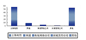 在國內(nèi),視訊市場的形成已經(jīng)初露端倪,眾多商家都開始瞄準(zhǔn)這個(gè)新的利潤增長點(diǎn)。2002年8月,上海電信正式將視訊業(yè)務(wù)命名為“新視通”,并陸續(xù)開通了上海至美國洛杉磯、新疆烏魯木齊、石河子、克拉瑪依等地區(qū)的公眾視訊業(yè)務(wù),同時(shí)還針對商用客戶和個(gè)人用戶啟動(dòng)了推廣計(jì)劃。由于上海是我國的貿(mào)易、金融、經(jīng)濟(jì)中心,許多國內(nèi)外的大型企業(yè)都在上海設(shè)有分支機(jī)構(gòu),市場潛力不可估量,眾多運(yùn)營商都在爭取上海的市場。目前,除了上海電信推出的“新視通”業(yè)務(wù)外,網(wǎng)通、有線網(wǎng)絡(luò)和其它公司都在上海推出了自己的視訊系統(tǒng)。根據(jù)我們對企業(yè)用戶的抽樣調(diào)查,下圖的市場占有率表明了視訊業(yè)務(wù)的競爭將會日益激烈。
