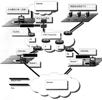 鑒于客戶是通信公司,有較強(qiáng)的系統(tǒng)管理能力,而且要求視訊和數(shù)據(jù)出口分開,視訊出口在北京,可以和VPN線路走相同的物理鏈路,不會造成路由設(shè)計(jì)上的問題,故將NAT放在客戶公司總部,由用戶自己管理,增加DIA出口和費(fèi)用。網(wǎng)絡(luò)通信拓?fù)鋱D如右所示。