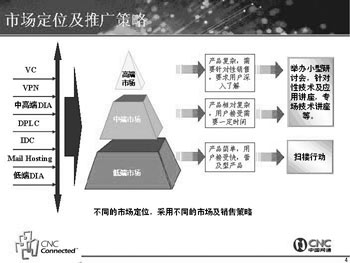 為了打開(kāi)網(wǎng)通視訊業(yè)務(wù)的局面,網(wǎng)通的推廣方案也非常完備,這位負(fù)責(zé)人向記者出示了一張圖(見(jiàn)左下圖),詳細(xì)地解釋了網(wǎng)通視訊業(yè)務(wù)的市場(chǎng)定位及推廣策略。首先是通過(guò)媒體宣傳給客戶(hù)以整體印象,力求覆蓋面廣,眾所周知; 接著以直郵形式有針對(duì)性地發(fā)放詳細(xì)單頁(yè)資料,深入宣傳;然后以小型研討會(huì)、技術(shù)講座等形式,有針對(duì)性地召集當(dāng)?shù)啬繕?biāo)客戶(hù)/潛在用戶(hù),細(xì)論VC市場(chǎng)及產(chǎn)品; 最后是以巡展、樣板客戶(hù)案例造聲勢(shì),提高產(chǎn)品形象。