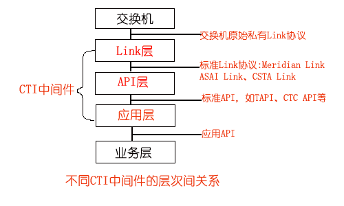 在Link層的基礎上,實現(xiàn)把標準Link協(xié)議轉化為標準的API,如CTC API、TAPI、JTAPI等,為CTI應用開發(fā)提供一套標準的API,屏蔽了不同交換機擁有的CTI協(xié)議和CTI接口,使應用程序員無需關心消息是如何在計算機和交換機之間傳遞,專注于客戶端的應用開發(fā),實現(xiàn)應用程序與交換機平臺無關性。