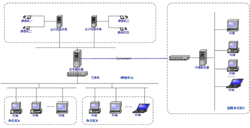 下屬各單位辦公區(qū)的工作終端或遠程(Internet)終端,可以連接到中心機房的轉(zhuǎn)播服務(wù)器上進行接收數(shù)據(jù)。用戶只需直接打開IE瀏覽器然后輸入轉(zhuǎn)播服務(wù)器的IP地址或者相關(guān)鏈接,進入到正在直播的會議現(xiàn)場,實現(xiàn)遠程實時參與會議的目的。