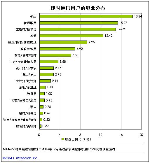 從即時通訊用戶的職業(yè)結(jié)構(gòu)來看,在中國的即時通訊用戶中,學(xué)生、普通公司職員、工程技術(shù)人員構(gòu)成了最主要的用戶群體,其中學(xué)生的比例最高,達到了18.24%?撮_學(xué)生是中國即時通訊的生力軍。
