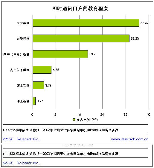 從即時通訊用戶的學(xué)歷水平來分析,在目前的即時通訊用戶中,大專以上教育程度的用戶比例達到了75%,占據(jù)了絕對高的比例。顯示出即時通訊用戶的整體教育水平非常高。