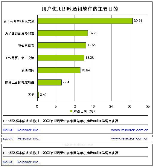即時通訊作為網(wǎng)民最常使用的應(yīng)用之一,即時通訊的多功能性可以滿足用戶的不同需求,達到不同的目的,根據(jù)艾瑞市場咨詢(iResearch)的研究結(jié)果,在問及用戶使用即時通訊的目的時,有31%的用戶選擇了“便于與同學(xué)/朋友交流”作為使用即時通訊軟件的最主要的目的,16%的用戶選擇“為了交到更多的朋友”作為作主要的目的,兩者相加的比例接近了50%。說明與朋友、網(wǎng)友間的交流聊天仍然是即時通訊軟件的最主要的功能。同時,即時通訊軟件用戶一般還同時使用包括文件傳送、語音聊天、郵件檢查、群組聊天、手機綁定等其他功能。而文件傳輸是其中最主要的一項功能。