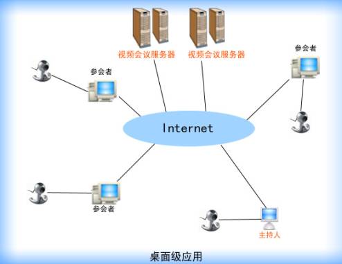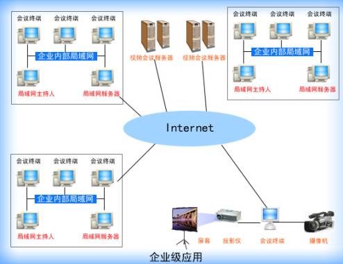 在企業(yè)級別的應用中,企業(yè)將服務器構(gòu)架在公司內(nèi)部,遠程用戶及局域網(wǎng)內(nèi)部的用戶均可登錄服務器,實現(xiàn)交互。企業(yè)級視頻會議系統(tǒng)的應用實際上就是將桌面級視頻會議與會議室級視頻會議系統(tǒng)有機的結(jié)合在一起,客戶端硬件外設(shè)可以按照以上的建議,根據(jù)各終端不同的需求進行配置。