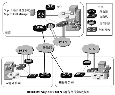 根據(jù)西北石油公司各地分公司電話全部是PSTN直線電話,沒(méi)有單位內(nèi)部的PBX,不能通過(guò)語(yǔ)音網(wǎng)關(guān)把這些直線電話統(tǒng)一接入到IP網(wǎng)絡(luò)上這一實(shí)際情況,方案提供方博達(dá)公司提供了一款小型BDCOM SuperB Mini語(yǔ)音網(wǎng)關(guān),來(lái)解決PSTN程控電話統(tǒng)一接入IP語(yǔ)音網(wǎng)絡(luò)的問(wèn)題。使用BDCOM SuperB Mini并結(jié)合西北石油公司組建的企業(yè)內(nèi)部VoIP網(wǎng)絡(luò),克服了傳統(tǒng)語(yǔ)音網(wǎng)關(guān)解決方案的不足和缺點(diǎn)。