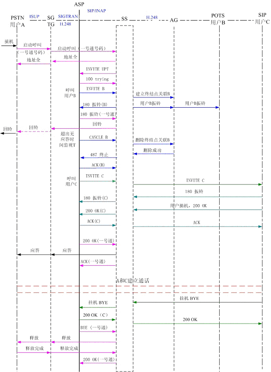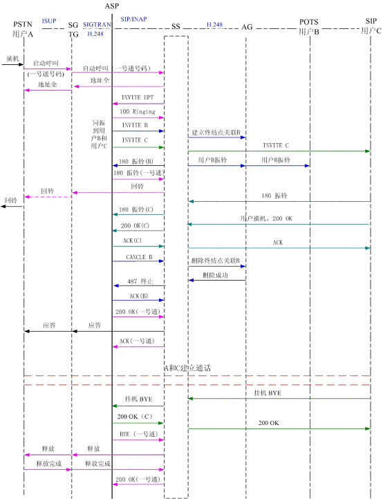 圖4為PSTN用戶A撥打一號(hào)通用戶,同振到軟交換域AG下POTS用戶B和SIP用戶C,其中軟交換和應(yīng)用服務(wù)器以SIP協(xié)議相連,軟交換和AG、軟交換和TG以H.248協(xié)議相連?梢钥吹,用戶B和用戶C同時(shí)振鈴,用戶C摘機(jī)應(yīng)答,應(yīng)用服務(wù)器取消了對(duì)用戶B的振鈴。雙方通話,通話結(jié)束,用戶C掛機(jī),系統(tǒng)釋放了連接。