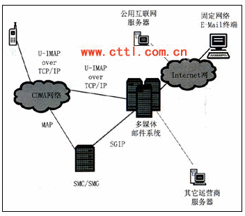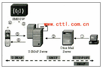 互聯(lián)網(wǎng)郵箱到聯(lián)通U-IMAP手機(jī)終端業(yè)務(wù)支持互聯(lián)網(wǎng)郵件用戶直接向手機(jī)終端用戶發(fā)送郵件,需要郵件服務(wù)器、U-IMAP Server以及移動(dòng)手機(jī)終端的支持,根據(jù)實(shí)際情況,有時(shí)還需要短信中心的支持,用于向移動(dòng)手機(jī)終端發(fā)送郵件到達(dá)的通知。郵件服務(wù)器與U-IMAP Server之間的協(xié)議采用SMTP協(xié)議,U-IMAP