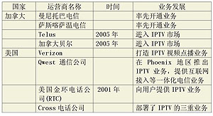 在北美IPTV市場(chǎng),加拿大傳統(tǒng)電信公司走在前面。美國(guó)的IPTV業(yè)務(wù)是由電視運(yùn)營(yíng)商開始推出的,現(xiàn)在已實(shí)現(xiàn)了數(shù)據(jù)、語(yǔ)音、多媒體三重業(yè)務(wù)整合目標(biāo)。獨(dú)立本地運(yùn)營(yíng)商開展了DSL網(wǎng)絡(luò)和光纖網(wǎng)絡(luò)上的IPTV業(yè)務(wù)。2004年10月,美國(guó)三家主要的電信運(yùn)營(yíng)商RBOC—SBC、南方貝爾和Verizon公開了IP視頻計(jì)劃,開始在美國(guó)大規(guī)模部署IPTV網(wǎng)絡(luò)。RBOC—SBC已計(jì)劃2005年全面進(jìn)入IPTV市場(chǎng)。目前,美國(guó)幾乎所有大的電話公司都在致力于開發(fā)IPTV服務(wù)。