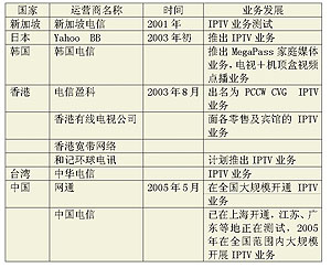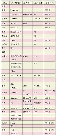 1999年,英國(guó)Video Networks公司率先在全球推出了IPTV業(yè)務(wù),此后,國(guó)外許多電信運(yùn)營(yíng)商先后進(jìn)入IPTV市場(chǎng)。但在2004年之前,多數(shù)運(yùn)營(yíng)商僅側(cè)重于IPTV的試驗(yàn),2004年后,IPTV開始從試驗(yàn)階段向商用階段轉(zhuǎn)變,許多業(yè)界人士認(rèn)為,2005年將成為IPTV年。