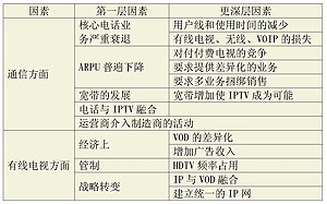 IPTV市場(chǎng)發(fā)展的驅(qū)動(dòng)力主要有兩個(gè)方面:一是通信方面的因素,二是有線電視方面的因素(詳見(jiàn)表4)。