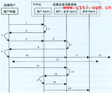 在POP點(diǎn)處,每類業(yè)務(wù)有一個(gè)“業(yè)務(wù)Agent”,其生命周期與運(yùn)營商此類業(yè)務(wù)的生命周期相同,即從運(yùn)營商開通此類業(yè)務(wù)到運(yùn)營商終止提供此類業(yè)務(wù)為止,因此“業(yè)務(wù)Agent”基本上是長(zhǎng)期存在的。“業(yè)務(wù)Agent”負(fù)責(zé)對(duì)不同用戶的同類業(yè)務(wù)進(jìn)行匯聚,統(tǒng)一與遠(yuǎn)端的“業(yè)務(wù)Agent”進(jìn)行業(yè)務(wù)交互。