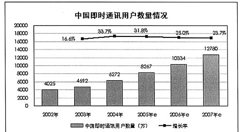 圖為:02年-07年中國即時(shí)通訊用戶數(shù)量及增長(zhǎng)率 來源:艾瑞咨詢
