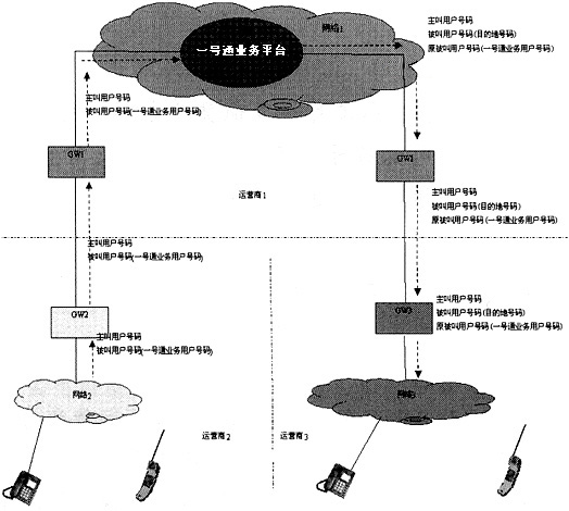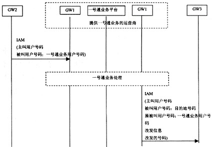 在圖1中,運(yùn)營商2的用戶撥叫運(yùn)營商1的一號通業(yè)務(wù)用戶號碼時,呼叫將通過運(yùn)營商2的網(wǎng)關(guān)(GW2)、運(yùn)營商1的網(wǎng)關(guān)(GW1)接續(xù)到運(yùn)營商1的一號通業(yè)務(wù)平臺中。一號通業(yè)務(wù)平臺根據(jù)一號通業(yè)務(wù)用戶設(shè)置的接續(xù)規(guī)則,將呼叫翻譯到指定的目的地號碼。目的地號碼可能是運(yùn)營商1的用戶,也可能是其他運(yùn)營商的用戶。