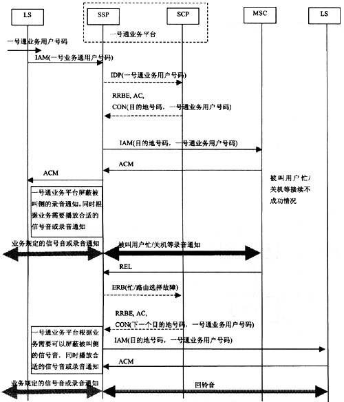 基于目前現(xiàn)網(wǎng)的信令處理方式,當(dāng)一號通業(yè)務(wù)用戶所設(shè)定的目的地號碼為移動用戶時,如果出現(xiàn)被叫用戶忙、關(guān)機(jī)等接續(xù)不成功情況,現(xiàn)有的移動交換機(jī)會給主叫用戶播放錄音通知,通知用戶,如果主叫用戶不掛機(jī),則在通知播放完畢后向前端交換機(jī)后向返回REL消息,釋放呼叫。一號通業(yè)務(wù)平臺收到釋放消息后根據(jù)業(yè)務(wù)需要,進(jìn)行下次接續(xù)。如果按照原有的信令流程,主叫用戶會先聽到被叫用戶忙或關(guān)機(jī)的錄音通知,然后又聽到下一個呼叫的回鈴音。為了避免出現(xiàn)這種現(xiàn)象,一號通業(yè)務(wù)平臺要能夠屏蔽被叫側(cè)播放的錄音通知和信號音,并根據(jù)業(yè)務(wù)需要向主叫用戶播放合適的信號音或錄音通知,具體的屏蔽方式由一號通平臺自行確定。以智能網(wǎng)實(shí)現(xiàn)、ISUP消息為例,具體的消息流程如圖3所示。