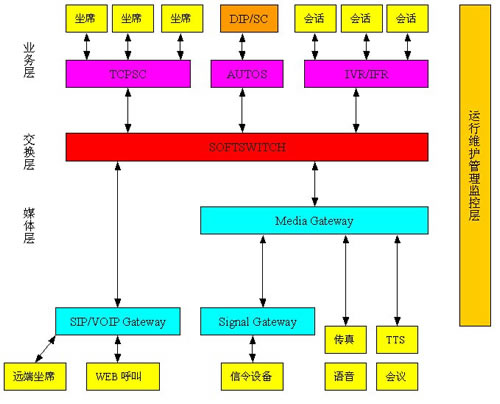 2003 Server操作系統(tǒng)上的平臺(tái)軟件實(shí)現(xiàn)CallCenter所需的功能:ACD,CTI,IVR。CT Ways與傳統(tǒng)CallCenter平臺(tái)的在軟件方面的最大區(qū)別是平臺(tái)軟件運(yùn)行在網(wǎng)格計(jì)算環(huán)境下,TCP/IP作為網(wǎng)絡(luò)通信協(xié)議。在硬件方面的區(qū)別是IVR硬件資源可與信令及交換資源合用。