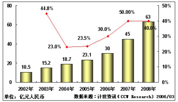 計(jì)世資訊(CCW Research)預(yù)測(cè)認(rèn)為,2006年和2007年視頻會(huì)議市場(chǎng)將以30%和50%的增長(zhǎng)率飛速增長(zhǎng)。市場(chǎng)規(guī)模分別達(dá)到30億和45億人民幣。而2008年隨著奧運(yùn)建設(shè)的告一段落,整個(gè)市場(chǎng)將進(jìn)入一個(gè)消化調(diào)整期,市場(chǎng)發(fā)展速度則逐步開(kāi)始放慢。