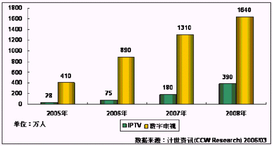 當(dāng)然,從國際上看,電信和廣電的融合是主流趨勢(shì),但從目前國內(nèi)的情況來看,由于牽扯到利益沖突,融合并非一句話的事,仍需要克服重重阻力。計(jì)世資訊(CCW Research)的數(shù)據(jù)顯示,在2005年IPTV的用戶只有僅僅28萬人,而廣電數(shù)字電視用戶已經(jīng)達(dá)到410萬人。相信在未來幾年內(nèi)這個(gè)比例很難有大的變動(dòng)。IPTV要想趕超數(shù)字電視還需要付出更大的努力。