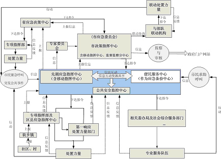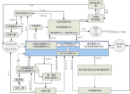 指政府決策指揮中心、先期指揮中心、便民服務(wù)中心、公共安全監(jiān)控中心,通常還有移動指揮中心和災(zāi)備中心,以及其它節(jié)點的建設(shè)。一般地,先期指揮中心與便民服務(wù)中心可互為備份。政府決策指揮中心對重大、特別重大突發(fā)公共事件進(jìn)行協(xié)調(diào)、決策,偏重于自然災(zāi)害與生產(chǎn)安全方面,而一般、較重突發(fā)公共事件仍保持由各專業(yè)指揮部指揮、處置,只有當(dāng)跨區(qū)、跨機(jī)構(gòu)需要協(xié)調(diào)時由政府決策指揮中心進(jìn)行協(xié)調(diào)。