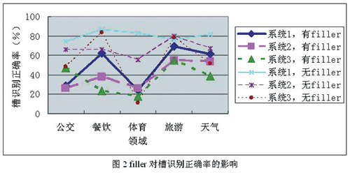 對(duì)于電話連續(xù)語音識(shí)別來說,由于錄制環(huán)境是辦公室真實(shí)環(huán)境,因此噪音并不是影響性能的主要因素。電話連續(xù)語音識(shí)別分為5個(gè)子領(lǐng)域,每個(gè)子領(lǐng)域各有一套語法。評(píng)測(cè)句子由語法生成的有效成分在前后加上任意長(zhǎng)的填充詞(filler)構(gòu)成,如語法生成的句子為“從天安門到中關(guān)村怎么坐公交車”,而實(shí)際錄制的句子是“你好,請(qǐng)問從天安門到中關(guān)村怎么坐公交車,可以查到嗎?”,其中的“你好,請(qǐng)問”和“可以查到嗎”就是filler。由分析可以發(fā)現(xiàn),不同領(lǐng)域內(nèi)的槽識(shí)別正確率相差很大。這主要有兩個(gè)原因,一是不同領(lǐng)域的語法復(fù)雜度不同,二是不同領(lǐng)域內(nèi)有filler的句子所占比例不同。為了進(jìn)一步衡量filler對(duì)識(shí)別的影響,選取三個(gè)識(shí)別系統(tǒng),將有filler的句子和沒有filler的句子分別計(jì)算識(shí)別率,統(tǒng)計(jì)結(jié)果如圖2所示。從圖中可以看出,filler對(duì)識(shí)別的影響是相當(dāng)大的,無filler的句子比有filler的句子識(shí)別正確率可以高幾十個(gè)百分點(diǎn)。