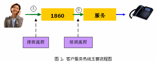 因此,根據(jù)客戶(hù)服務(wù)中心的實(shí)際情況,我們首先優(yōu)化了排班流程,建立并優(yōu)化了培訓(xùn)流程。我們首先選擇這兩個(gè)流程的思路如下:從客戶(hù)角度來(lái)看,10086熱線(xiàn)在接受用戶(hù)咨詢(xún)服務(wù)時(shí)的主要流程如下:撥號(hào)→1860→服務(wù)提供→掛機(jī)。圖示如下: