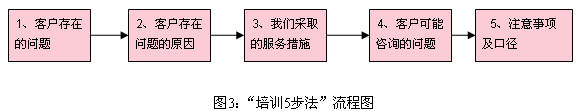 我們要求所有培訓(xùn)課件都按“客戶(hù)存在的問(wèn)題→客戶(hù)存在問(wèn)題的原因→我們采取的服務(wù)措施→客戶(hù)可能咨詢(xún)的問(wèn)題→注意事項(xiàng)及口徑”這五步進(jìn)行編纂。各步驟含義說(shuō)明如下: