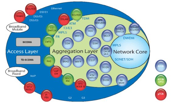 在匯聚層與核心網(wǎng),對(duì)高可用性、傳輸容量與事務(wù)處理能力要求很高。ATCA通常是高性能的最佳選擇。mTCA與ATCA可對(duì)電信網(wǎng)中要求的操作性與高可用性提供與生俱來的支撐,而其它IT技術(shù)卻做不到。ATCA與mTCA作為一種系統(tǒng)技術(shù),是電信級(jí)業(yè)務(wù)與商用組件之間自然而然的選擇。