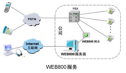 當(dāng)網(wǎng)頁(yè)訪問(wèn)客戶點(diǎn)擊該企業(yè)網(wǎng)站頁(yè)面上的WEB800圖標(biāo)時(shí),就可以直接撥打至已指定的企業(yè)內(nèi)部電話分機(jī)(或企業(yè)外部普通電話)。