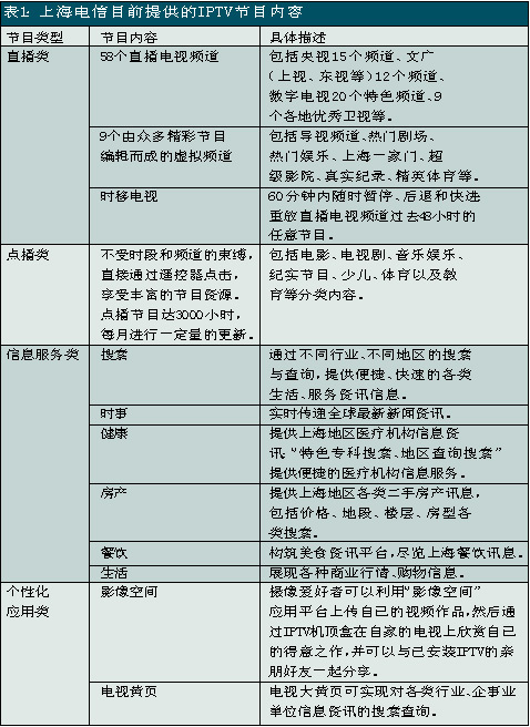 上海電信是國(guó)內(nèi)關(guān)注并切入IPTV業(yè)務(wù)較早的電信運(yùn)營(yíng)商之一,自2005年就開始積極測(cè)試和試驗(yàn)。此次上海電信在全上海市范圍內(nèi)推出IPTV業(yè)務(wù),被業(yè)界看作是“中國(guó)IPTV規(guī)模商用的新紀(jì)元”。除了影視節(jié)目收看、視頻內(nèi)容點(diǎn)播、時(shí)移功能外,上海電信的IPTV服務(wù)還包括時(shí)事新聞、遠(yuǎn)程醫(yī)療、視頻房產(chǎn)信息、餐飲信息、天氣預(yù)報(bào)、票務(wù)查詢等信息服務(wù)以及可視電話、IPTV游戲等個(gè)性化應(yīng)用。其中IPTV的直播頻道有58個(gè),視頻點(diǎn)播可選節(jié)目量達(dá)3000小時(shí)以上。另外,上海電信還推出了影像空間和電視大黃頁(yè)等應(yīng)用服務(wù),攝像愛好者可以利用“影像空間”應(yīng)用平臺(tái)上傳自己的視頻作品,然后通過(guò)IPTV機(jī)頂盒在自家的電視上欣賞自己的得意之作,并可以與已安裝IPTV的親朋好友一起分享;電視大黃頁(yè)可實(shí)現(xiàn)對(duì)各類行業(yè)、企事業(yè)單位信息資訊的搜索查詢。