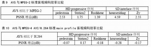 對視頻編碼標準進行客觀評價的常用方法是峰值信噪比PSNR。表9、表10分別給出了AVS與MPEG-2標準以及AVS與MPEG-4 AVC/H.264標準main