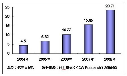 我國移動電子政務已經(jīng)進入高速發(fā)展時期:2005年的市場規(guī)模達6.82億元,增長率為51.6%;2006年將達到10.33億元。預計未來三年內,我國移動電子政務復合增長率將達到51.5%,截至2008年,市場規(guī)模將突破20億元。