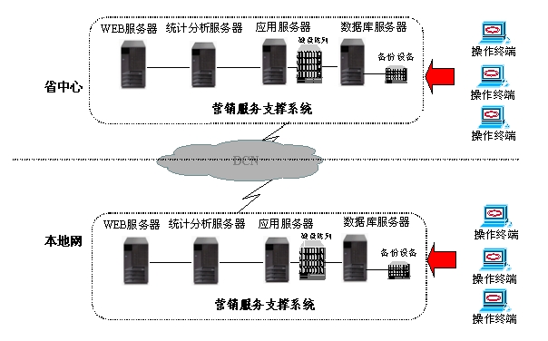 采用全省集中方式建設(shè)的營銷服務(wù)支撐系統(tǒng)由兩臺IBM服務(wù)器形成雙機(jī)集群,安裝了數(shù)據(jù)庫服務(wù)器、WEB服務(wù)器、應(yīng)用服務(wù)器、統(tǒng)計(jì)分析服務(wù)器。