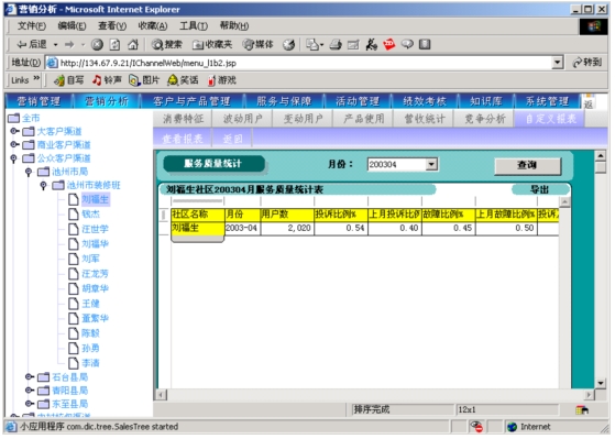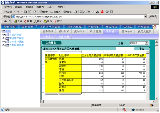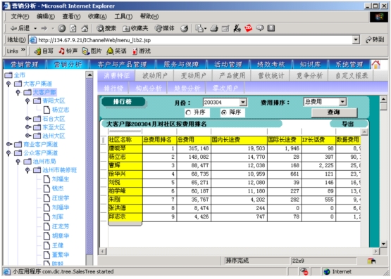 本系統(tǒng)通過對本地計(jì)費(fèi)帳務(wù)系統(tǒng)、網(wǎng)間結(jié)算系統(tǒng)、1000號客戶服務(wù)系統(tǒng)、“九七工程”系統(tǒng)、資源管理系統(tǒng)的動態(tài)相關(guān)數(shù)據(jù)的提取,按日(天)記錄并分析開展?fàn)I銷服務(wù)工作所需的客戶基本資料、客戶關(guān)系資料、客戶收入信息、客戶消費(fèi)行為信息、客戶變動信息、客戶障礙信息、客戶投訴信息、客戶競爭動態(tài)信息等支撐信息,指導(dǎo)各類客戶經(jīng)理開展有針對性營銷服務(wù)工作。