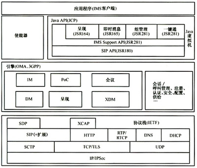 通過對于IMS客戶端相關規(guī)范的研究與分析,可以看出IETF提供了IMS客戶端所需要的協(xié)議部分,包括詳細的SIP信令消息交互,服務參數(shù)協(xié)商、媒體流的建立、XML文檔的交互等。3GPP和OMA提供了IMS客戶端所需要的服務引擎,與不同應用服務器之間的交互方式以及如何接入到IMS網(wǎng)絡等。JCP提供了一整套IMS客戶端上Java應用程序所需的標準Java應用編程接口。由此可以總結(jié)歸納出IMS客戶端軟件架構(gòu)參考,具體參見圖2。