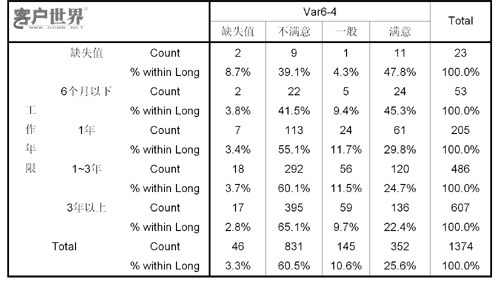 我們使用SPSS進(jìn)行交叉分析后,得到了不同層次的座席代表滿意度數(shù)據(jù),例如: