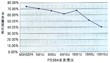 由圖1可知,當HSDPA分配功率為5W時,HSDPA對網(wǎng)絡(luò)覆蓋沒有很大影響;當它為10W時,如果HSDPA用戶數(shù)不大,影響也有限;但是,當它為10W時,如果HSDPA用戶數(shù)持續(xù)增加,則會產(chǎn)生嚴重影響。在下行從NOHSDPA的74%降低到10W15U的40.62%時,PS384業(yè)務(wù)降低了近一半。同時,隨著業(yè)務(wù)速率的提高,網(wǎng)絡(luò)影響越大。另外,在一定的HSDPA功率分配前提下,隨著HSDPA用戶數(shù)的增加,過載率增大,網(wǎng)絡(luò)中高速數(shù)據(jù)業(yè)務(wù)的比例隨之減少,各點上的用戶速率不斷降低;同時,用戶的增多使得各小區(qū)的HSDPA發(fā)射功率不斷增大,導致區(qū)域中間各點的終端接收功率普遍增加。