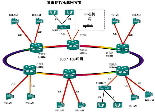 下面簡單介紹一下網(wǎng)通某地市基于CESP的IPTV承載網(wǎng)方案。傳統(tǒng)的IPTV承載都是通過2.5G MSTP或RPR千兆環(huán)來傳輸流媒體數(shù)據(jù)的,其問題在于:按照現(xiàn)有的IPTV用戶數(shù)和明年計(jì)劃發(fā)展用戶數(shù),平均每個(gè)村有近50個(gè)IPTV用戶,一般一個(gè)鄉(xiāng)要管轄30個(gè)村。按照每戶IPTV 2M的帶寬分配,一個(gè)鄉(xiāng)就需要3G的接入帶寬才能滿足業(yè)務(wù)發(fā)展的需求,而現(xiàn)有的千兆環(huán)和2.5G MSTP根本就無法滿足日益膨脹的數(shù)據(jù)業(yè)務(wù)需求。因此,亟須采用一種全新的數(shù)據(jù)承載平臺(tái)來改造現(xiàn)有的縣、鄉(xiāng)、村的數(shù)據(jù)接入網(wǎng)絡(luò)。