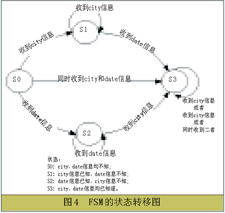 在總結(jié)了前人工作經(jīng)驗(yàn)和結(jié)合本系統(tǒng)的實(shí)際問題的基礎(chǔ)上,我們?cè)趯?duì)話管理的具體實(shí)現(xiàn)上,將框架理論和有限狀態(tài)自動(dòng)機(jī)理論相結(jié)合,完成了一個(gè)智能的對(duì)話管理模塊。我們先將對(duì)話管理限制在天氣查詢領(lǐng)域。在系統(tǒng)中,通過人機(jī)之間的對(duì)話和確認(rèn),系統(tǒng)需要得到要查詢的時(shí)間和地點(diǎn)信息之后反饋查詢結(jié)果。