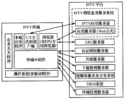 IPTV中間件是當(dāng)前IPTV業(yè)界關(guān)注的熱點(diǎn)之一。業(yè)界對(duì)于中間件沒有確切的定義,一般認(rèn)為:中間件是實(shí)現(xiàn)異構(gòu)軟件實(shí)體間互連互通的一類軟件,則IPTV中間件就是實(shí)現(xiàn)IPTV系統(tǒng)中各個(gè)節(jié)點(diǎn)之間互連互通的一類軟件。IPTV系統(tǒng)中的節(jié)點(diǎn)類型眾多,包括終端、EPG(電子節(jié)目指南)服務(wù)器、內(nèi)容分發(fā)系統(tǒng)、業(yè)務(wù)管理系統(tǒng)、網(wǎng)管監(jiān)控系統(tǒng)、DRM(數(shù)字版權(quán)管理)、內(nèi)容管理系統(tǒng)、頭端系統(tǒng)等,除終端外,其他節(jié)點(diǎn)都可以統(tǒng)稱為平臺(tái)側(cè),因此IPTV中間件也可以分為平臺(tái)中間件和終端中間件兩類。平臺(tái)中間件實(shí)現(xiàn)系統(tǒng)平臺(tái)中各個(gè)應(yīng)用服務(wù)器之間的互連互通,終端中間件實(shí)現(xiàn)IPTV終端和系統(tǒng)平臺(tái)之間的互連互通。