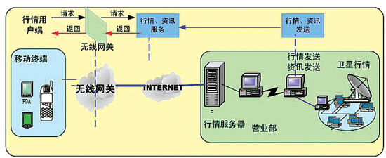 無(wú)線(xiàn)終端的請(qǐng)求通過(guò)各無(wú)線(xiàn)網(wǎng)絡(luò)進(jìn)入移動(dòng)證券系統(tǒng)的無(wú)線(xiàn)接入網(wǎng)關(guān),經(jīng)無(wú)線(xiàn)網(wǎng)關(guān)轉(zhuǎn)發(fā)至移動(dòng)交易行情服務(wù)平臺(tái)。如果是讀取行情資訊,行情服務(wù)平臺(tái)直接提供行情資訊服務(wù);如果是進(jìn)行委托交易,由委托接入服務(wù)器將委托數(shù)據(jù)轉(zhuǎn)發(fā)到總部或營(yíng)業(yè)部,再由總部或營(yíng)業(yè)部交易處理服務(wù)平臺(tái)進(jìn)行處理。換句話(huà)說(shuō),在無(wú)線(xiàn)網(wǎng)關(guān)接入后,其后的委托服務(wù)、行情服務(wù)都可采用現(xiàn)有的網(wǎng)上交易的通道和系統(tǒng)。