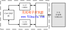 (1)存儲結(jié)構(gòu):DM642的存儲器系統(tǒng)由片內(nèi)內(nèi)存L1、L2和片外外存兩部分組成,L1,L2和片外SDRAM構(gòu)成了整個存儲器系統(tǒng)的三級層次結(jié)構(gòu),如圖2所示。其中,片內(nèi)內(nèi)存采用兩級緩存結(jié)構(gòu),第一級由L1P和L1D組成,L1距離DSP核最近,數(shù)據(jù)訪問速度最快,只需一個時鐘周期,只能作為不能尋址的Cache使用。第二級L2是一個統(tǒng)一的程序/數(shù)據(jù)空間,可以整體作為SRAM映射到存儲空間,也可以整體作為第二級Cache,或是二者按比例進行組合。第三級是片外外存,一般由SDRAM構(gòu)成。L1Pcache大小為16KB,直接映射,每行大小32