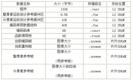 經(jīng)過優(yōu)化的程序和常用的數(shù)據(jù)結(jié)構(gòu)的大小可以放在L2中。所以按照上面的分析將L2配置為256KBSRAM,將程序代碼段(.text)、變量初值表(.cint)、常量字符串(.const)、全局變量靜態(tài)變量(.bss/.far)、堆棧段(.stack)等放入L2SRAM當中,全局堆(.sysmem用于動態(tài)存儲器分配)置于外部存儲器。表1總結(jié)了編碼器所要用到的存儲空間分配情況。