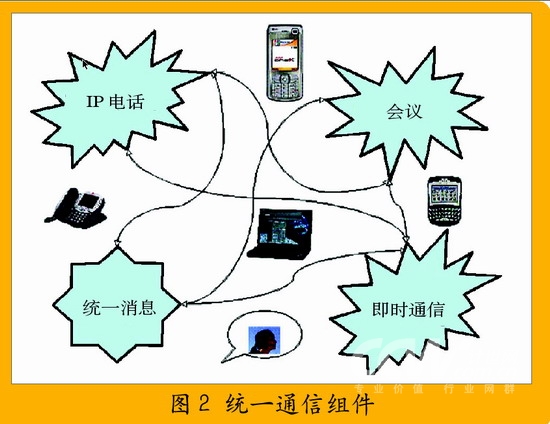 通信的終端可能是桌面電話、計算機、手機或者PDA。這4個部分之間存在緊密的聯(lián)系,比如說電話語音可以轉(zhuǎn)換為統(tǒng)一消息;電話不可達時,可以采用即時消息溝通或者小組成員可以使用多種方式參與到同一個會議中來等等。而所有這些聯(lián)系可能建立在統(tǒng)一的平臺之上: